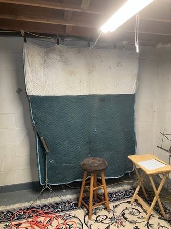 Available. Include phone number in reply. 4 - moving quilts, approx. 80"x70". Fair condition, but serviceable. Used for basement recording studio. Includes hanging system. Work table, shelf and...