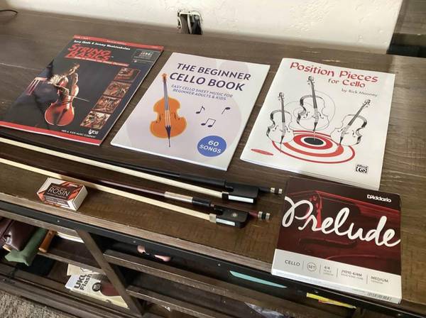 2003 Prima Voce 4/4 Cello, with 1 used bow and 1 brand new bow 3 beginner books a brand new set of strings brand new rosin. The strings that are on it are still in good shape. It does not have a case though, bought this 2 weeks ago just trying to get my money back. I finally figured out what instrument I want to learn to play