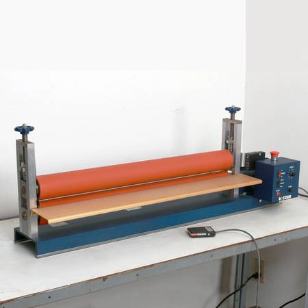 In excellent, like-new condition. It is hardly used, and it shows--only one 100-foot roll of adhesive has been run through it. The rollers are spotless. Included are the foot pedal and the Operation Guide, both in great condition. $1200.