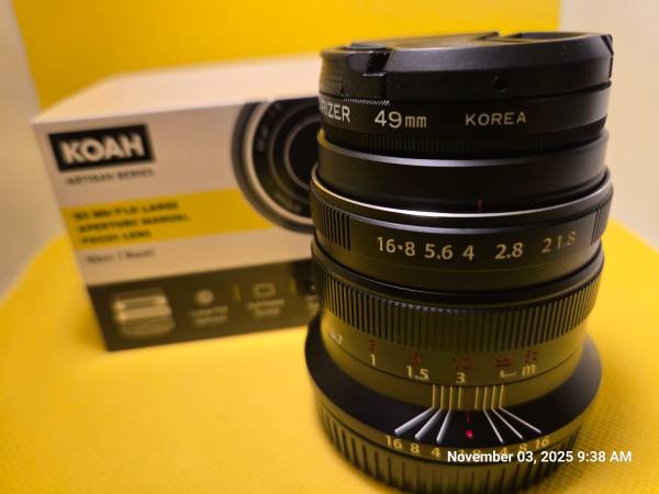 • Lens…..Koah 55mm 1.8 manual lens with caps, filter, for great portraits. (this lens is totally brand new, only 20 photos taken with it )