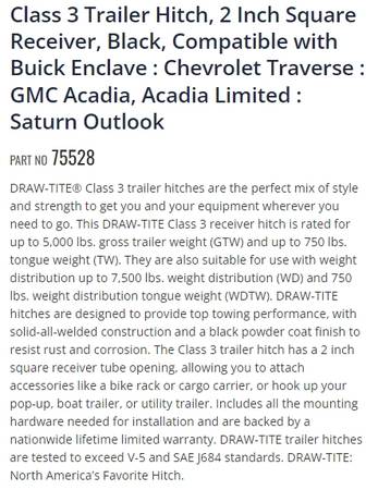 You are looking at a used DRAW-TITE Part Number: 75528 Class 3 hitch. It fits the Buick Enclave, Chevy Traverse, GMC Acadia, and Saturn Outlook. It has a 2 inch receiver. Does not include the tongue or mounting hardware. Overall it is in good used condition. Manufacturer description and information can be found in the pictures.