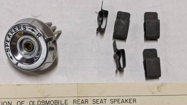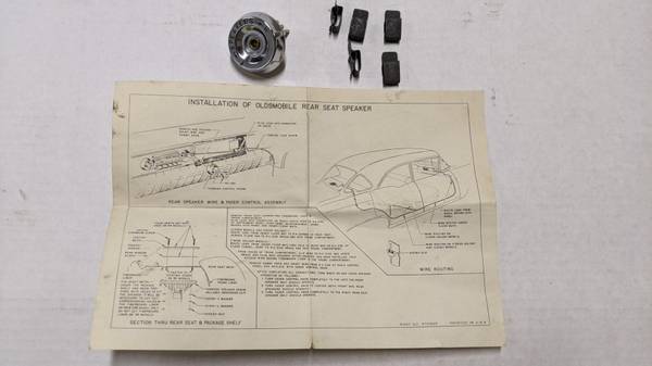 57 Olds rear speaker control. Looks to be new. Includes installation instructions, control, and wiring clips. See pictures.