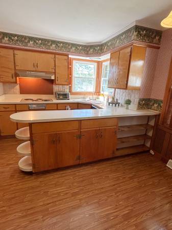 The eat-in kitchen has a breakfast area with a bar. You will love the beautiful original wood tone in wall oven and cook top range. These two appliances look and work as they did when the home was built!