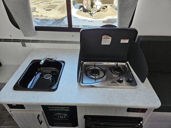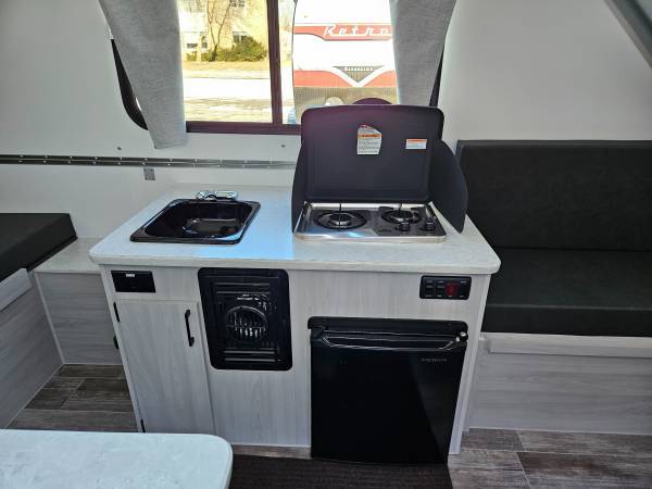 New 2025 Aliner Ranger 12 Aframe camper. Sleeps 3-4. Only 1631 pounds! Loaded with options! Two burner stove, 12v refrigerator, furnace, AC, water heater, outside shower, high wind lift assist, and much more! Battery and spare tire included.