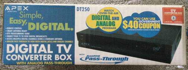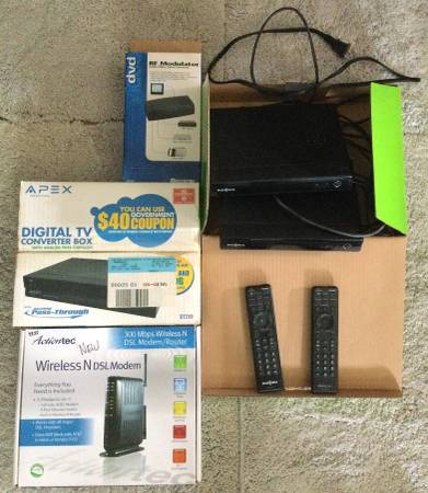 2 Insignia Digital TV Converter boxes , one used that works , one brand new in the box never been used , both have working remotes. 1 Apex digital TV Converter box brand new never been opened. 1 Actiontec Wireless Modem that is brand new in the box never been used . 1 Recoton RF Modulator Audio / Video Signal Converter , new in the box. Please view all of the photos carefully.