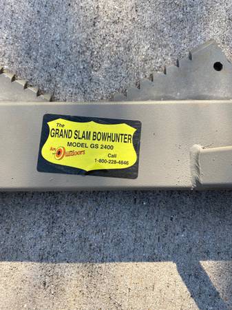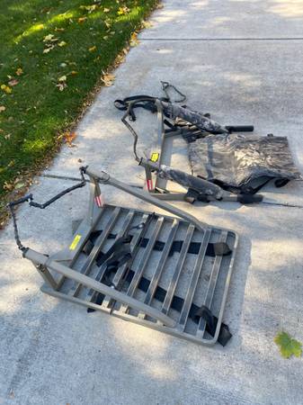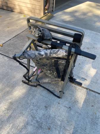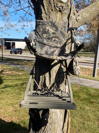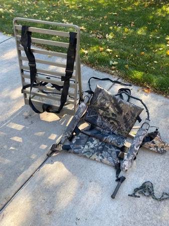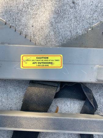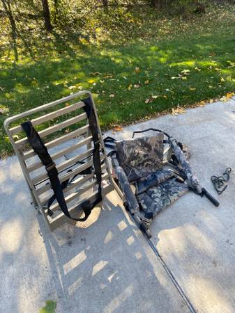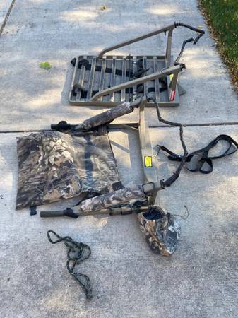API Outdoors Grand Slam Climbing Tree Stand - Very good condition - Shoulder straps for packing in and out - Storage pouch with securing strap and rope I also have four Rivers Edge climbing sticks...