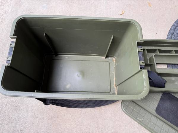 Pre Owned Olive Green Heavy Duty lockable Sportsman’s box, seat step stool with two nesting trays, storage beneath trays removable handle cover, heavy duty shoulder strap, price is $35. I used it to carry shells, vest, glasses etc to the range for shooting trap and during archery for rangefinder, bunks, extra tips, releases, etc. Lots of uses for sure. Dimensions are 21” L x 14” W x 17” T. Ad will be removed upon sale.