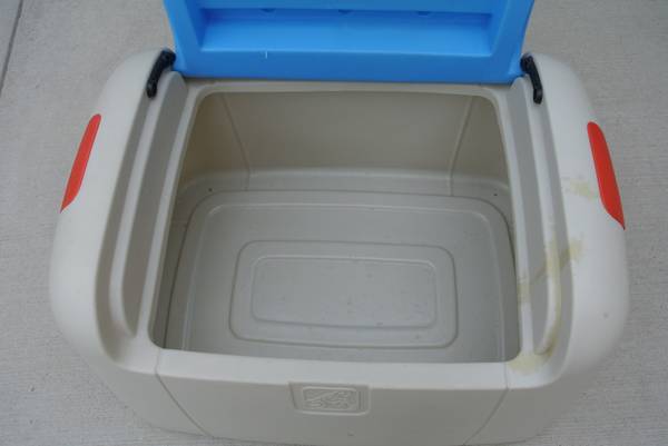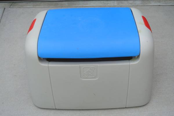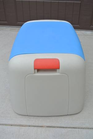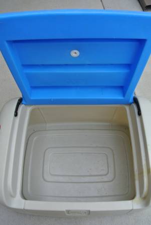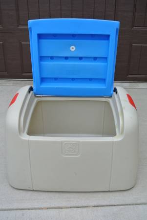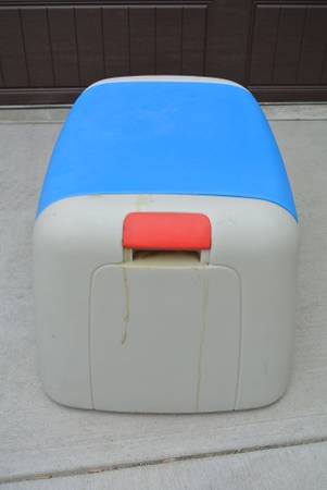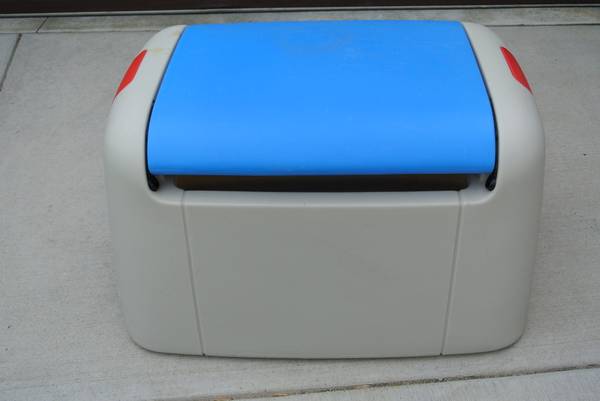 Storage chest for sporting goods equipment or outdoor toys. This item is in good condition and was stored in the garage. There are some dried oil stains on the unit, otherwise in excellent condition. Size measures: 30” (Length) x 21” (Depth) x 19” (Height)