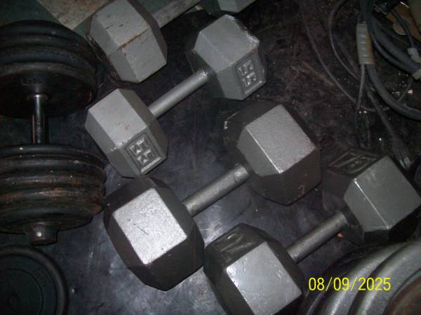 WEIGHT PLATES FROM 5# TO 50# - MANY INCLUDING GOLDS GYM, WEIDER, OLYMPIC AND OTHERS DUMB BELLS 95# $1.00 PER POUND