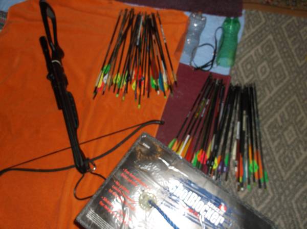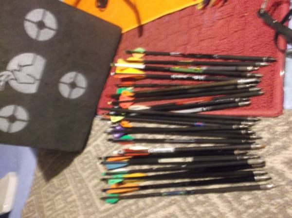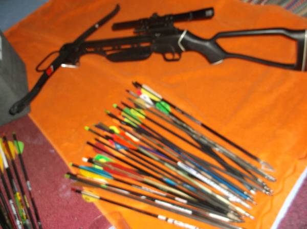 This Crossbow with scope & target that comes with 60 bolts carbons an alum. & 2 quivers ,FULL , lOTS OF BOLTS to HAVE Fun with An not worrying If ya lose 1 or 2 plus Kenzie shot blocker target . .The Cross bow works fantastic , Must be over 18 to buy from me ! $ 200.oo FIRM CASH ONLY No low balls Jeff show contact info