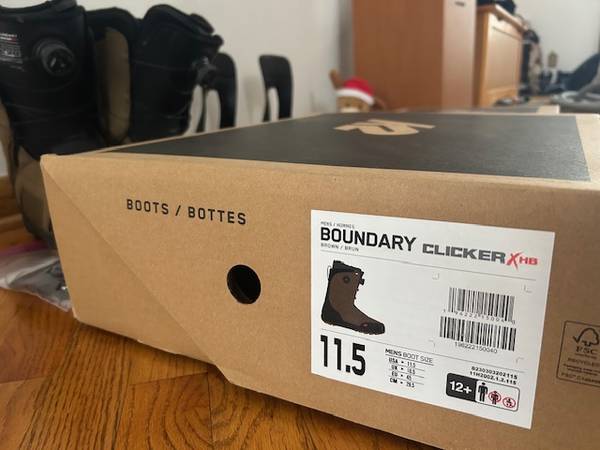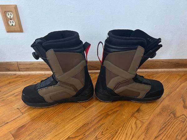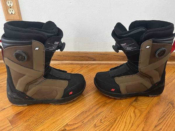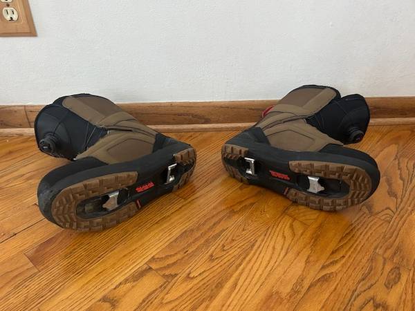 The boots are K2 Boundary Clicker XHB size 11.5. Boots have 2 boa systems along with another pull string thingie to tighten inside. Boots are also in good shape. I bought new and used them last snowboard season. I am 49 and don't go a super lot or beat them up doing tricks either.