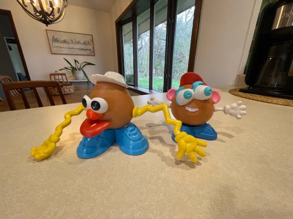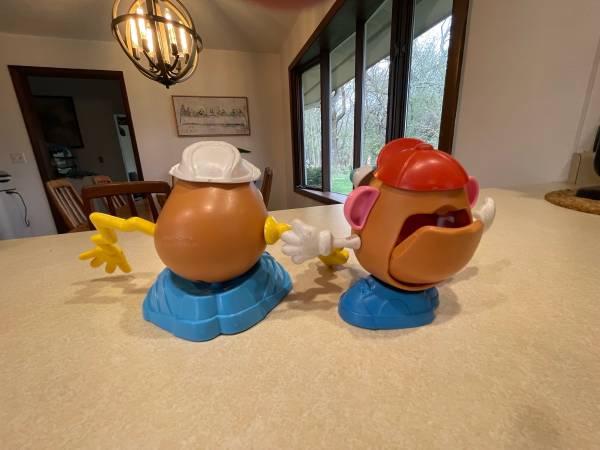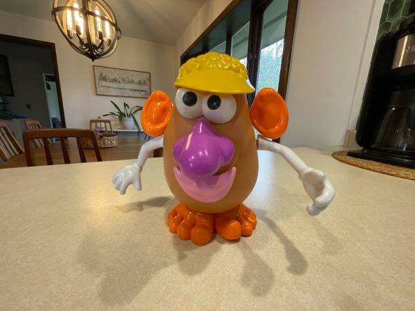 Selling the pictured Mr. Potato Head lot. Includes the Silly Suitcase, four large potatoes, two smaller ones, and all sorts of fun accessories. One potato is missing its backside. Some signs of wear on the potatoes and accessories. The suitcase shuts as it should and fits the pictured accessories. Please see pictures for details. Smoke-free home.