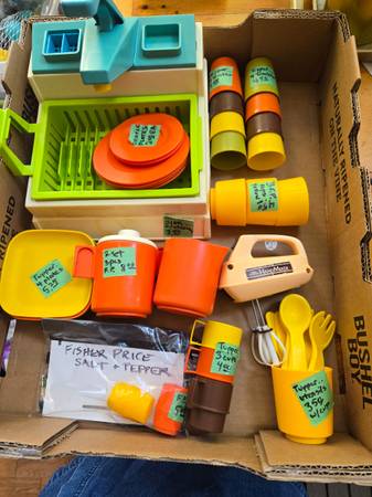 Includes assortment of sink, dishes, cups, utensils of Fisher Price & Tupperware. Fisher Price salt & pepper set included. Total cost $50.00 BONUS: Purchase today and I will include the toy...
