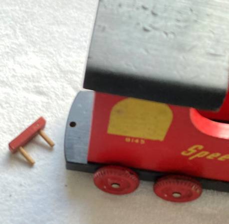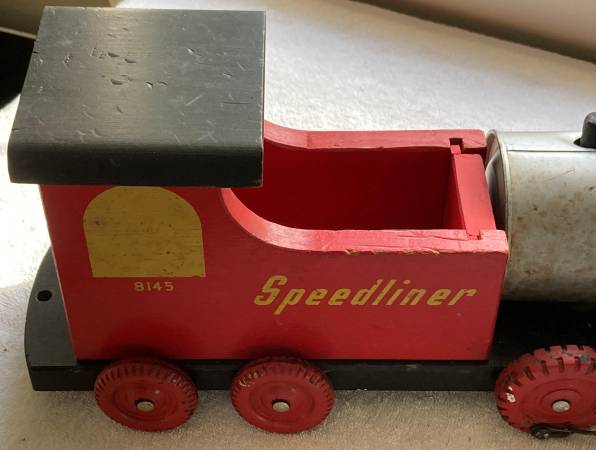 This train has followed me around for most of my life. It was produced by Rechner-Eiseman Co. in Milwaukee, Wis. Has been stored in a cardboard box in the rafters of my garage. A couple of parts have been replaced as original pieces are virtually impossible to find (1 smokestack and 1train car front door. Otherwise this toy is in great condition. Original decal is still attached. Wheels turn with the appearance of a wheel set.