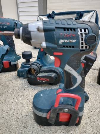 Bosch 18v Power Tool Collection Good quality set of 18v Bosch power tools. 30 min charger and (4) batteries included Adapters are available online, to enable using newer batteries, if you have a...