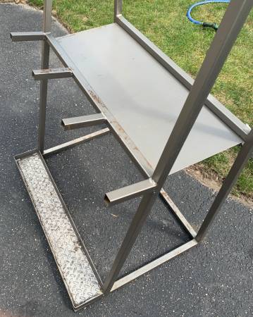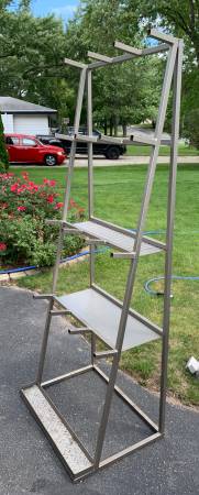 We have vertical storage rack to sell. This measures 32” wide, 24” deep, and 85” tall. This is heavy duty steel, fully welded construction. Has 4 vertical storage bays separated by square steel tube, a support shelf with raised steel edge at the bottom, and 3 heavy duty shelves. This rack is a great way to organize and sort the long stuff and small stuff in your garage. The shelves also accommodate the typical plastic hardware bins that are readily available. Great for steel, conduit, millwork, lumber, and more.