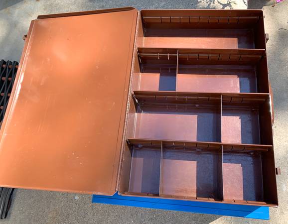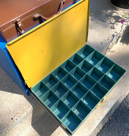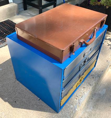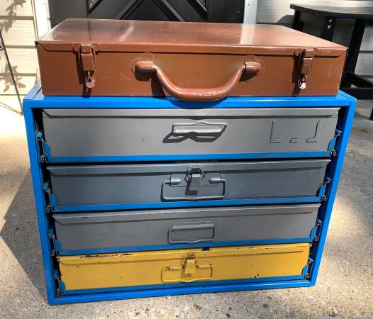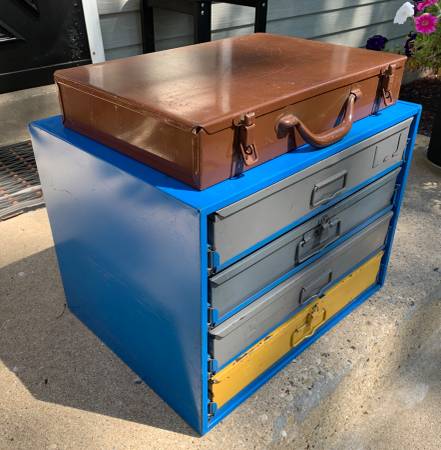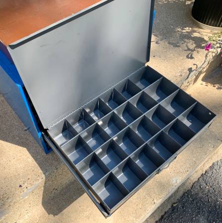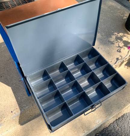 Selling a nice set of 5 metal hardware storage bins (compartment boxes) with a 4-drawer organizer cabinet rack to go with. This may be just what you need to help you get organized in your shop, basement, or garage. These are old-school, heavy-duty metal hardware bins some with metal compartments and dividers and some with removable plastic compartment trays. The 4-drawer organizer cabinet is all metal, with drawer slides and a tray for each hardware bin. The blue 4-drawer cabinet measures 20” wide, 16” deep, and 15” tall. Each storage bin measures about 18-1/2” wide, 12-1/2” deep, and 3-1/4” tall.