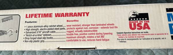 • It features a one-piece aluminum alloy ratchet wheel, high-strength electro-plated steel parts, and drop-forged steel slip hooks with safety latches.