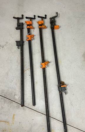 Two pairs heavy duty 3/4' iron pipe woodworking/wood gluing clamps for serious woodworkers, furniture restorers, etc., a must-have for any workshop. One pair is 3 feet long; one pair is 4 feet long. $25.00 per pair. Cash only please.