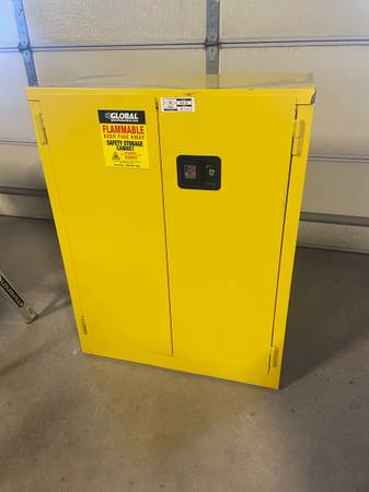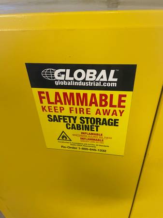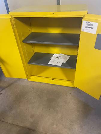 One new global industrial flammable materials cabinet. New scratch and dent model, something appears to have been set on top of it in transit. Opens, closes and locks as it should. The damage is to the top lid area as shown in the close up picture. Normally $865 plus tax and shipping, save hundreds. Model is BM28, a heavy duty made in USA cabinet. Manufactured on August 19, 2025 as shown. Leveling feet and two keys included. 19 inches deep, 35 inches wide and 45 45 inches tall. Probably about 1/2 inch more in each measurement!
