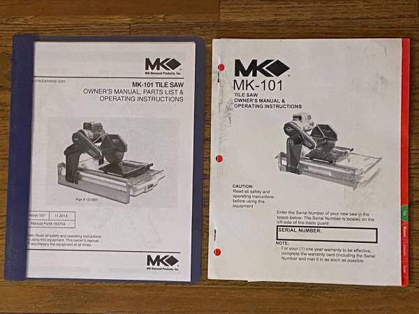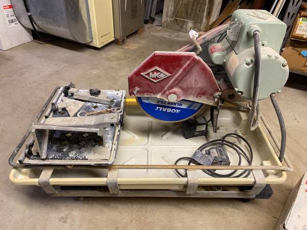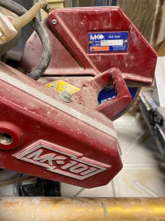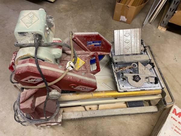 I am selling my personal MK101 10” Wet Tile Saw, in great working order, with no issues. I am not a contractor, but a homeowner that likes to do his own tile projects, so this saw and all of the attachments, have not seen much use. Included are additional blades, one NEW one for cutting porcelain tile, and a NEW glass tile cutting blade. Included are 2 NEW extra water pumps. Also includes all of the MK accessories for helping with cutting tile at various angles, and a straight cutting guide. (I have included 6 stock photos of most of the optional accessories). In addition, there are all the tile hand tools, such as various notched trowels, grouting tools, tile spacers, sponges, drill attachment for mixing mortar & grout, mixing bucket, (see the photos of them). Then there are lots of open and unopened tile supplies, such as mortar mixes and grout supplies, additives, haze remover, etc., (see the photos). With the owners manual. There are hundreds of dollars in all of the accessories and materials. $850. for ALL of it.