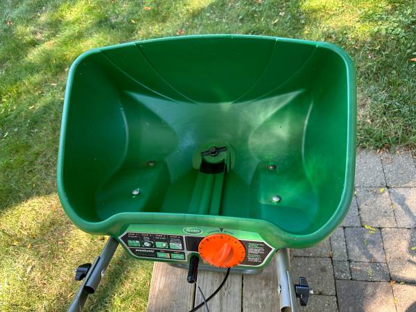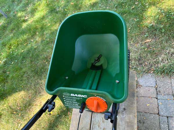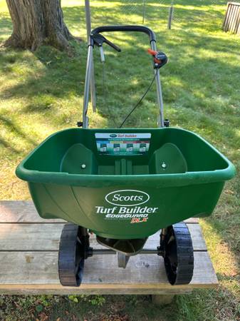 Scotts Turf Builder EdgeGuard DLX Push Broadcast Spreader Holds up to 15,000 sq.ft. for Seed, Fertilizer, Salt, Ice Melt