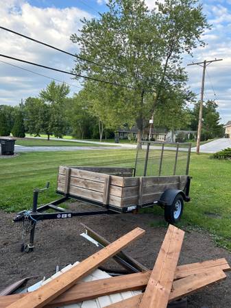 5 x 8 utility trailer with 4’ ramp. Has removable wooden sides made with treated lumber. Spare tire, working lights and metal grated base and plywood sheets to use over metal grating if desired....