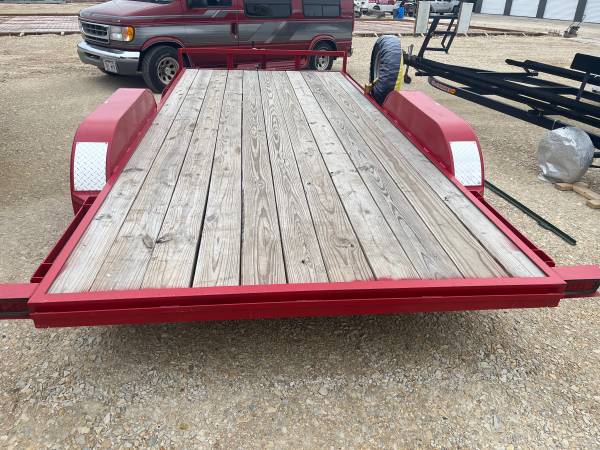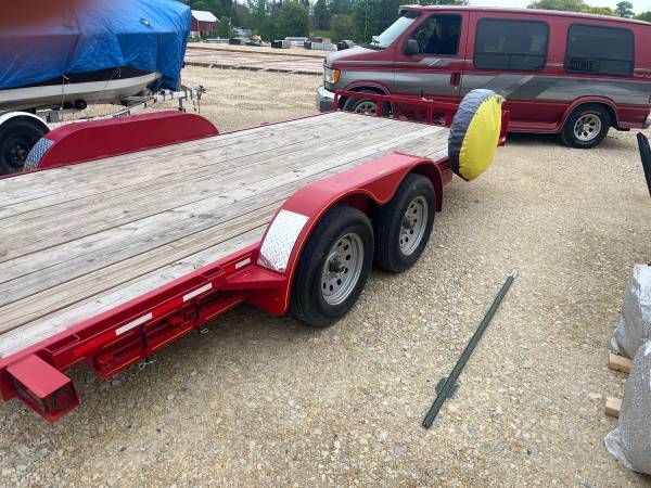 2024 trailer express red tandem axle car trailer, 2 inch coupler, (2) 3,500 easy lube axles, electric brakes front axle, rated 7,000 lbs, (2) 5 foot slide out ramps, spare tire carrier, and spare...