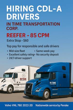 In Time Transportation Corp is a mid-size carrier focused on service, safety, and professional CDL-A drivers. We offer top pay to match quality and broker-direct freight for consistent miles.