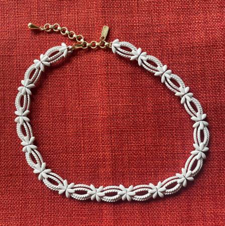 This vintage white enamel choker necklace is a stunning piece of fashion jewelry signed by Monet. The necklace features an adjustable hook closure and ideal for those that love vintage jewelry.