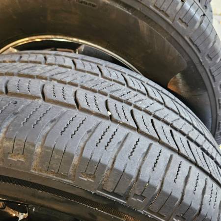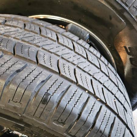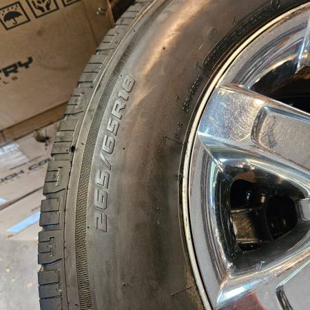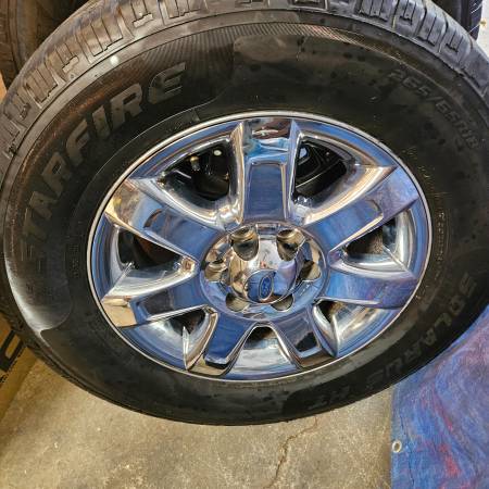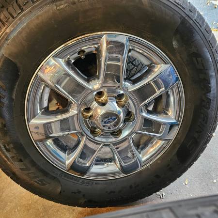 Set of 4 Ford F150 factory 18 inch rims with 265/65R18 tires with decent tread. 2 tires have inside wear. All have been balanced and have center caps included. No leaks or dry rot. Will fit F150 and Expedition with the 6X135 bolt pattern. Last picture shows the one wheel with chrome cracking. $375 Call or text Mike 4one4 six87 one 58 three