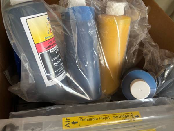 Got free. 7600. Tried to get working with flushes but yellow and magenta not working. Now with new cartridge there is an error and won’t stay in. Including paper, ink, refillable cartridges, flush cartridges and fluid. No stand.