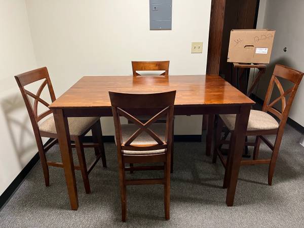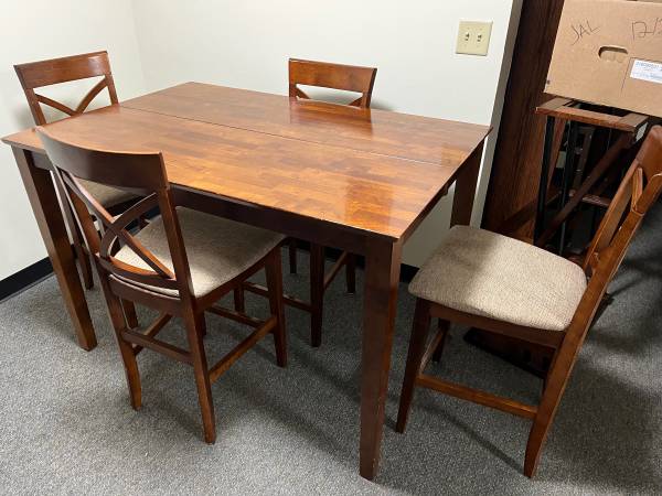 Solid (good) counter height kitchen table with four chairs. Some of the finish has come off the table (speckled from use), yet still has life and is a quality piece. I bought it for $75 used yet am loving and don’t want to heave it with me. As it is quality, it is heavy. Insert to make it longer, 1 chair has some stains (not horrible and might come out with cleaning) the other chairs are perfect.