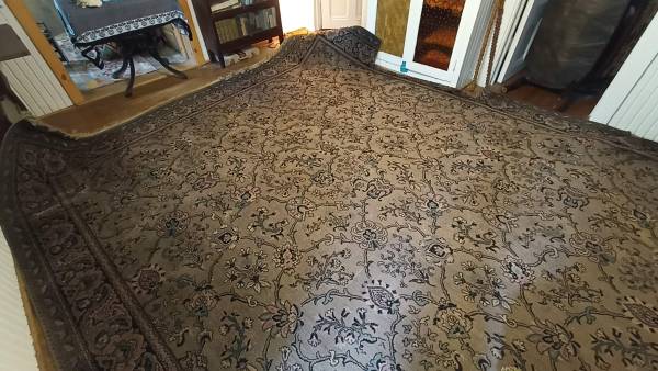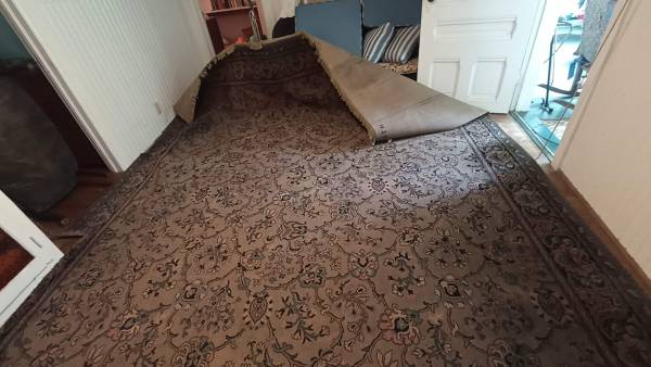 As pictured. Manufactured by Holmes Larchmont. It is worn in places, but relatively clean and still presentable. Part of one side was trimmed to fit around a cabinet, as pictured. But it is free to you, and you could put that part under a piece of furniture. Original price tag attached! Purchased from Gimbel Brothers Department Store (https://departmentstoremuseum.blogspot.com/2010/06/gimbels-milwaukee-wisconsin.html) in Milwaukee for $185. I don't know the age of it, but I suspect it has been in my family's lake cottage ever since. I need someone to come pick it up this week, by Friday. Please let me know when you could pick it up. Thank you.